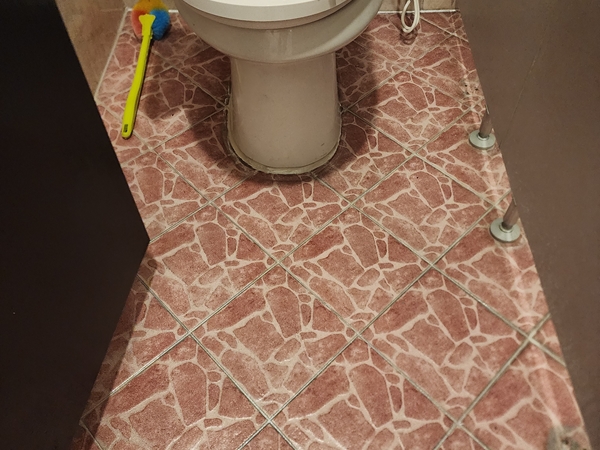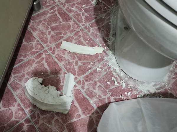 변기 테두리에 엉성하게 백시멘트 시공된 부분은