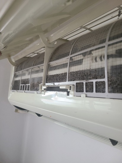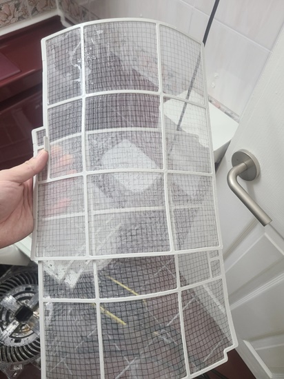 ▲ 겨우내 에어컨 내부 필터망에 묵혀있던 먼지와 곰팡이 제거 전 모습 ▲