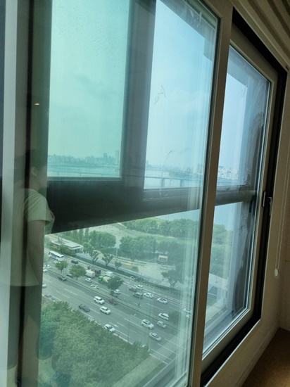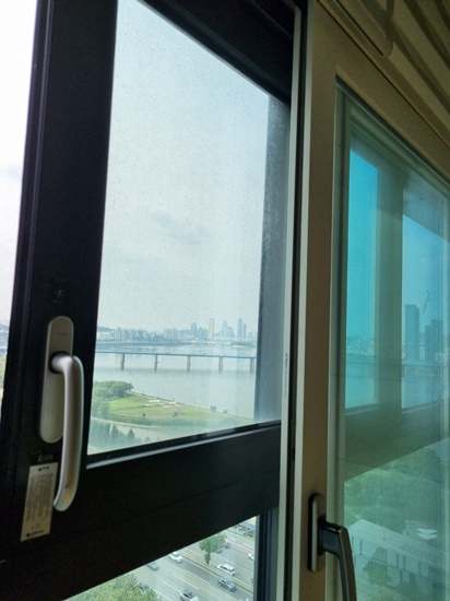 한강뷰에 거주 중이신 고객님이 외창의 뿌옇게 싸인 매연, 먼지 등으로