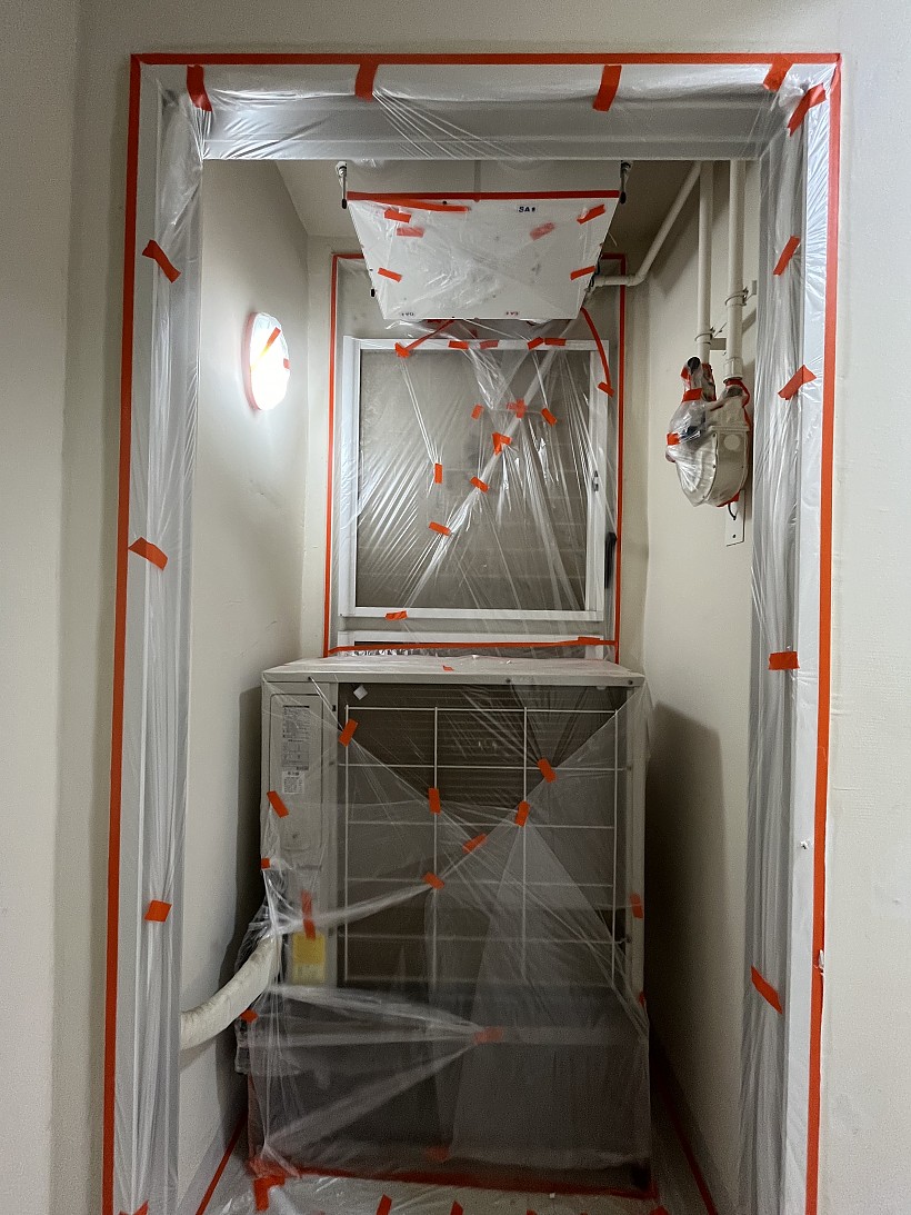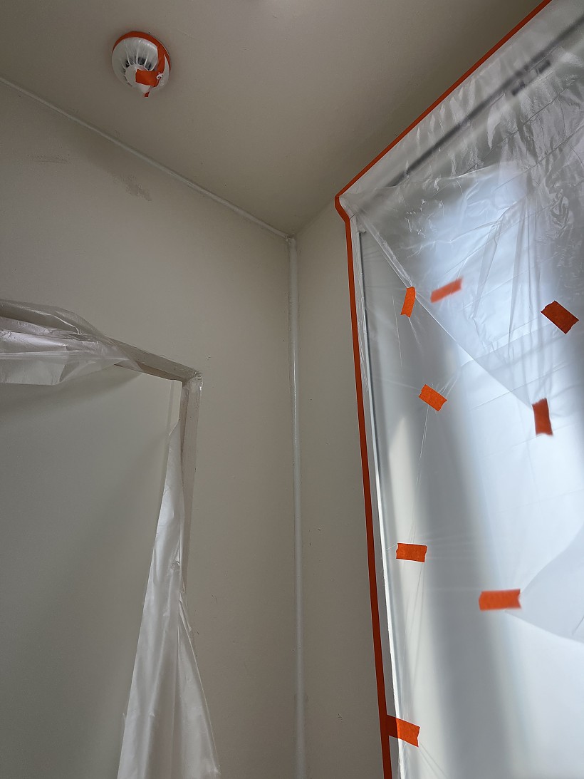 탄성 시공 전문가가 꼼꼼하게 보양 작업을 시작합니다.