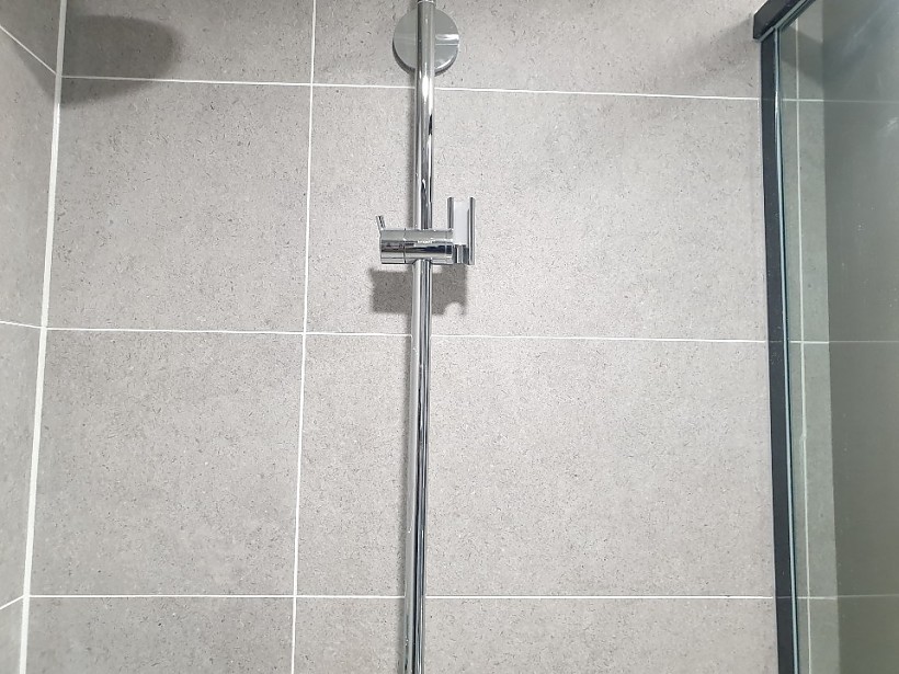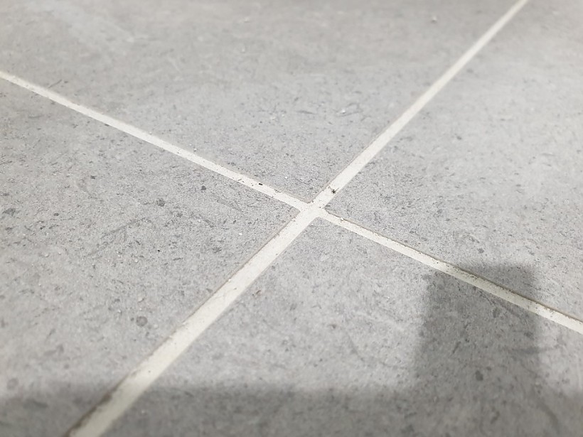 타일에 흰색의 펄이 들어 있어 펄이 없는 줄눈안료와 잘 어울렸습니다.