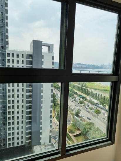한강뷰에 거주 중이신 고객님이 외창의 뿌옇게 싸인 매연, 먼지 등으로
