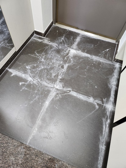바닥 타일 사이사이 백시멘트는 파지 작업을 우선 진행합니다.