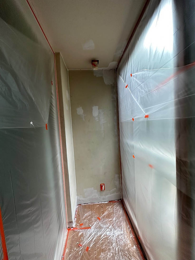 탄성 시공 전문가가 꼼꼼하게 보양 작업을 시작합니다.